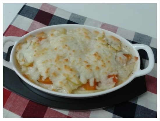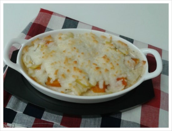 주재료: 감자3개,양파반개,단호박 약간, 우유, 고르곤졸라 소스.우유 반컵, 모짜렐라 치즈
