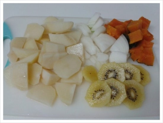 2.약간 익힌 감자와 단호박을 먹기 좋게 썰고, 양파,키위도 슬라이스 한다