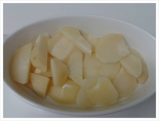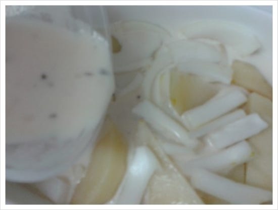 4.내열 용기에 감자와 양파를 담고 소스를 붓는다