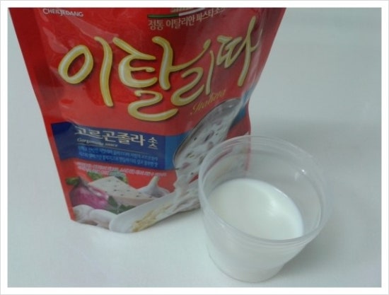 3.이탈리따 고르곤졸라 소스와 우유를 반컵씩 부어 섞는다