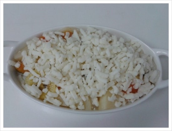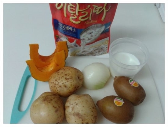 재료: 감자 3개, 단호박 2조각, 키위 2개, 양파 반개, 고르곤졸라 소스 반컵, 우유 반컵, 모짜렐라 치즈