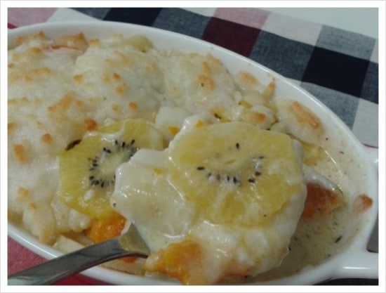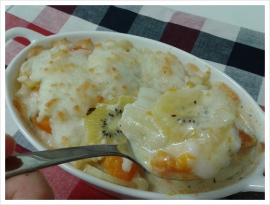 5.그 위에 키위와 단호박을 얹고 모짜렐라 치즈를 듬뿍 뿌려 180도 오븐에 20분 굽는다