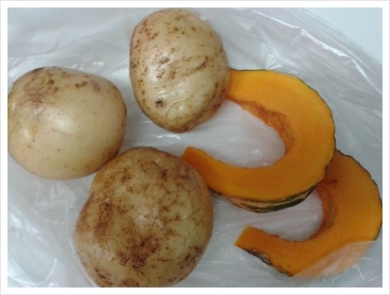 씻은 감자와 단호박을 비닐 봉지에 담아 렌지에 5분정도 익히기