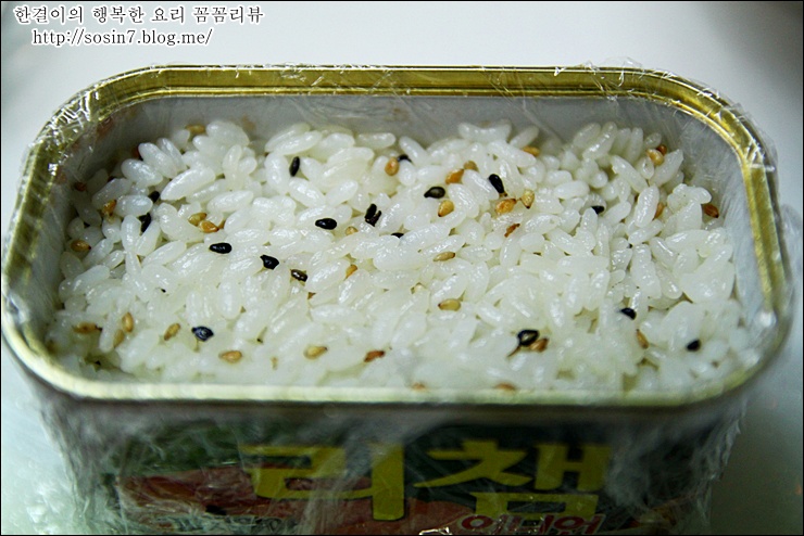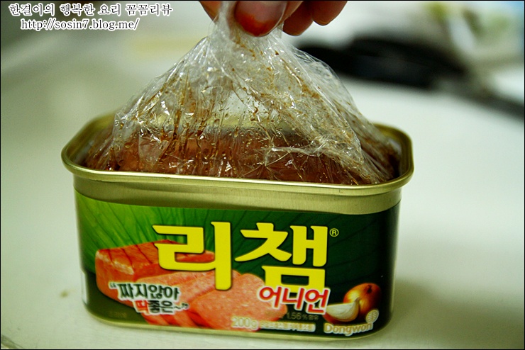 스팸통에 랩을깔고 밥을 꼭꼭 눌러줍니다.