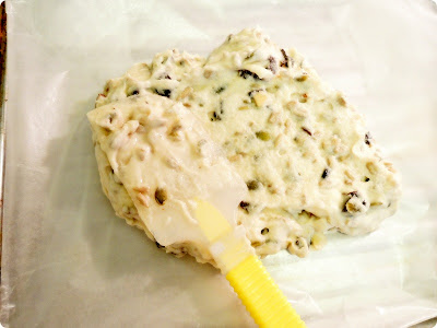 찹쌀가루, 베이킹 소다, 소금, 흑설탕, 1/2 컵 크림 1/2 컵 우유, 계란, 견과류, 건조 과일, 오븐