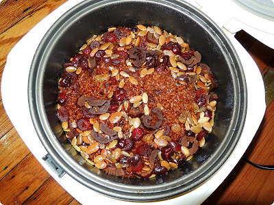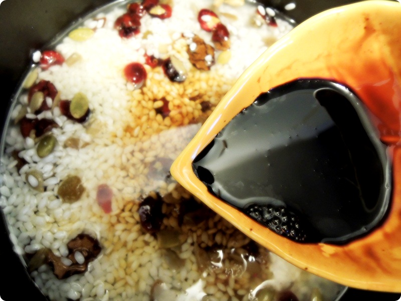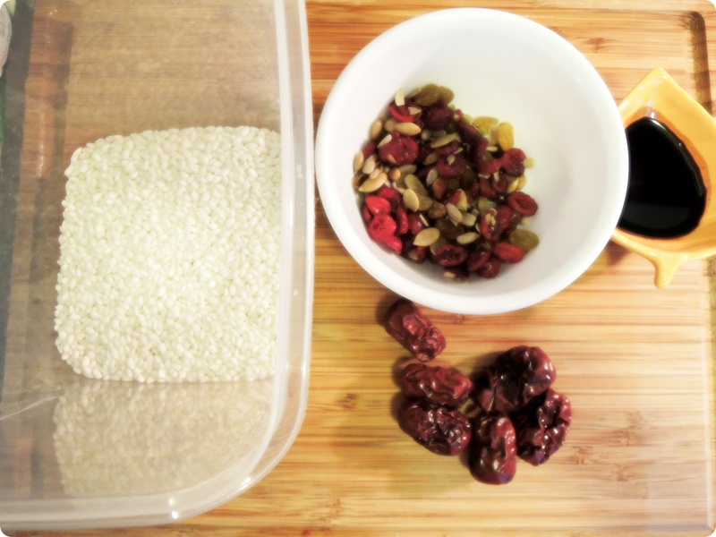材料:もち米、水、水飴、ごま油、醤油、シナモンパウダー、ナツメ、干しぶどう、ナッツ