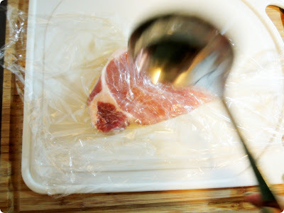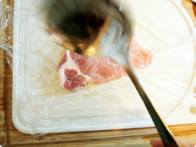 이제 돈까스용 돼지고기를 얆고 길게만들껀데요.. 저는 고기망치가 없어서 그냥 주걱으로 내리쳤습니다..아하하하..
