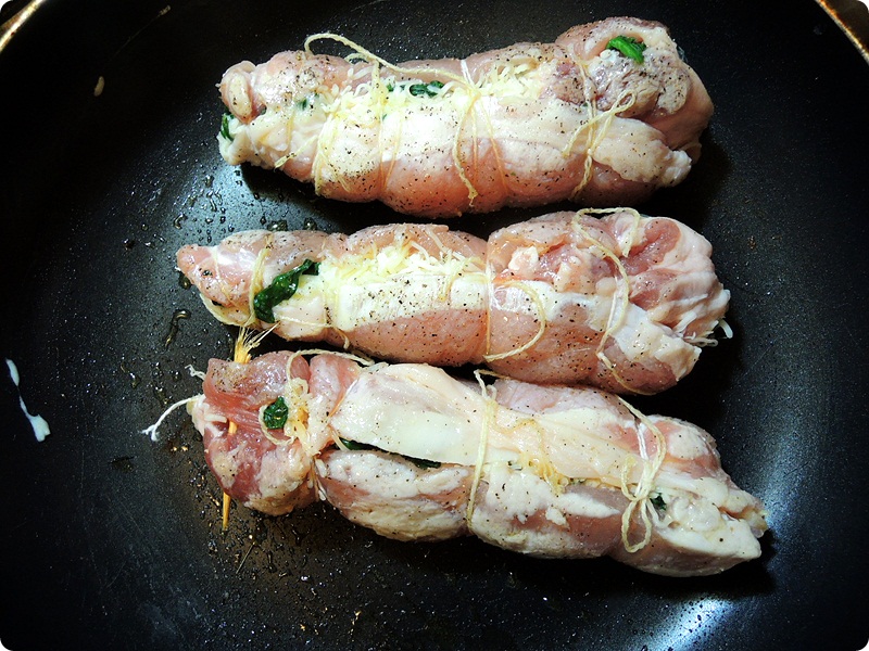 이제 데친 시금치를 깔고, 모짜렐라 치즈도 뿌리고, 된장소스를 말라준뒤 노끈으로 묶어줍니다.