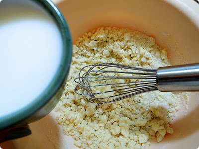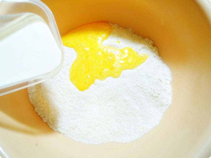 1 컵 Cornmeal 믹스, 1 계란, 1 TBSP 설탕, 3 TBSP 오일, 크림 약간, 1 컵 우유