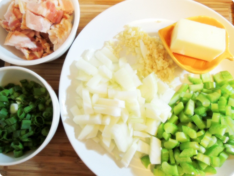 ベーコン、みじん切りネギ、1/2スティックバター、タマネギのみじん切り、1クローブニンニクのみじん切り、刻んだセロリの1月2日、約1カップ、新鮮なコーンブレッド、無脂肪のチキンスープ、二卵性双生児