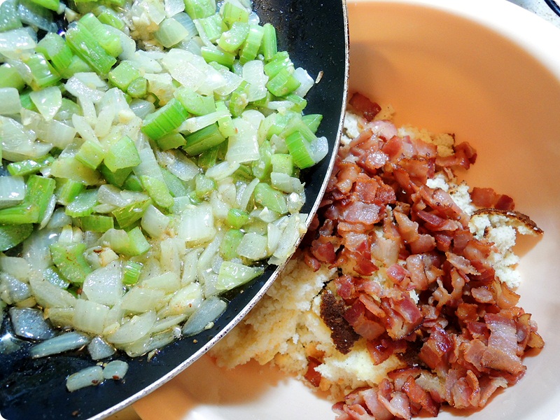 Bacon, chopped green onion, 1/2 stick butter, chopped onion, 1 clove minced garlic, about 1 1/2 cup of chopped celery, fresh cornbread, fat free chicken broth, two eggs