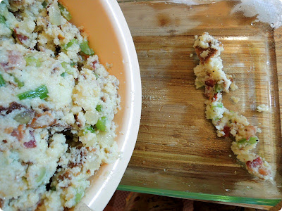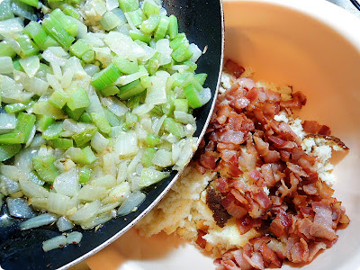 Now, add the bacon to the crumbled corned bread