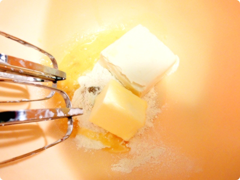 材料:クッキー、フィラデルフィアクリームチーズ、ベリーヨーグルト、砂糖、卵、Vanilla Abstract、ブルーベリージャムと小麦粉