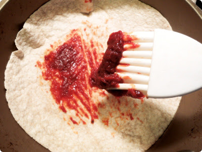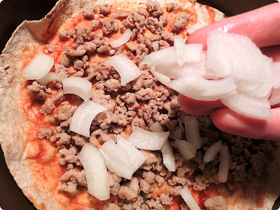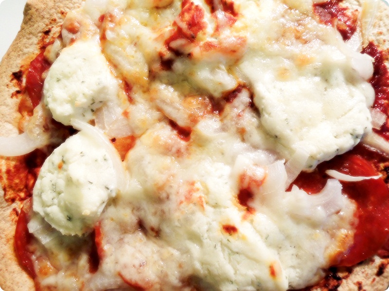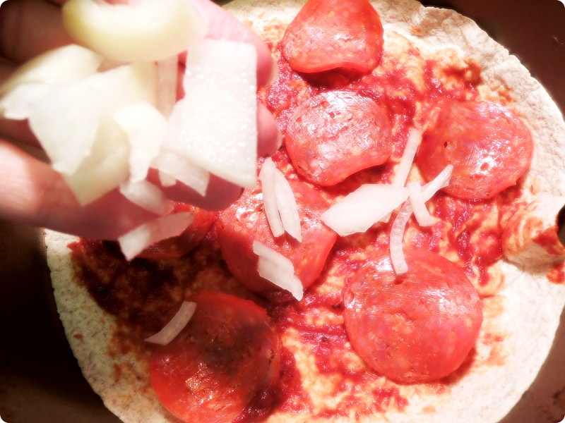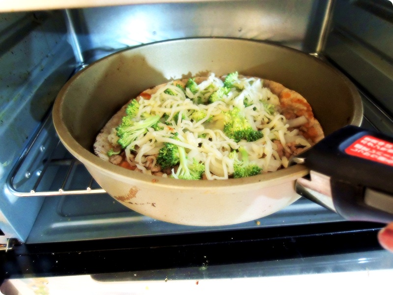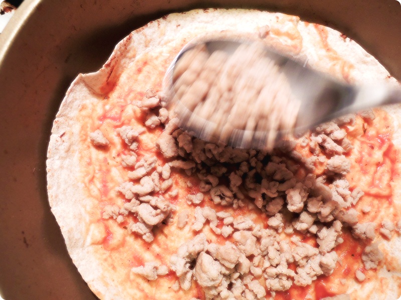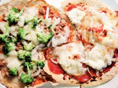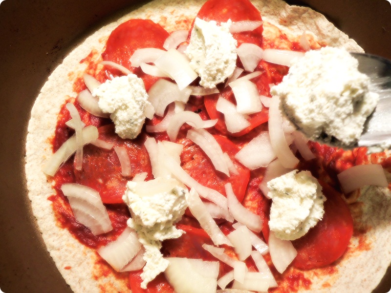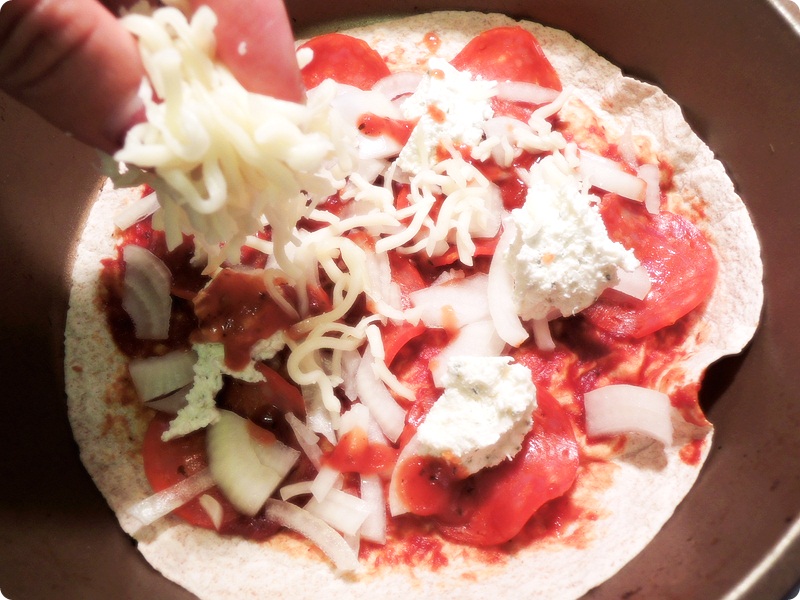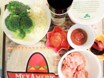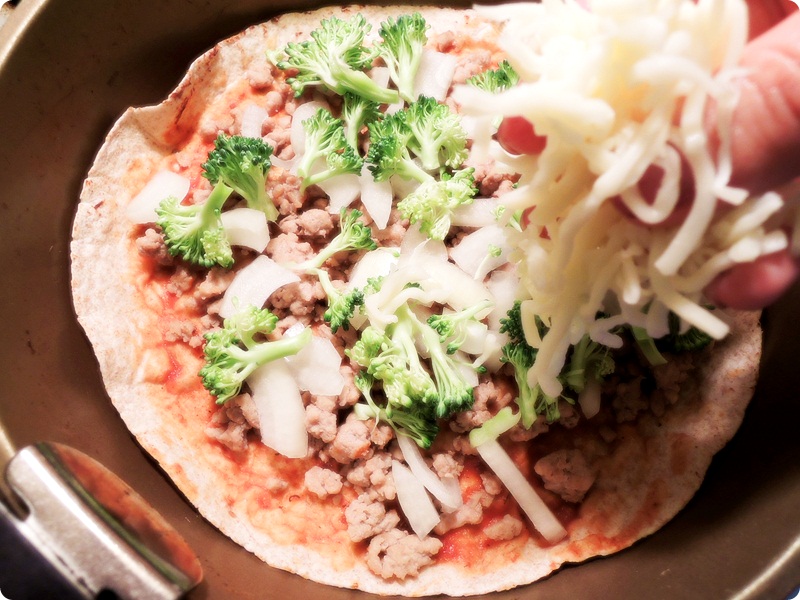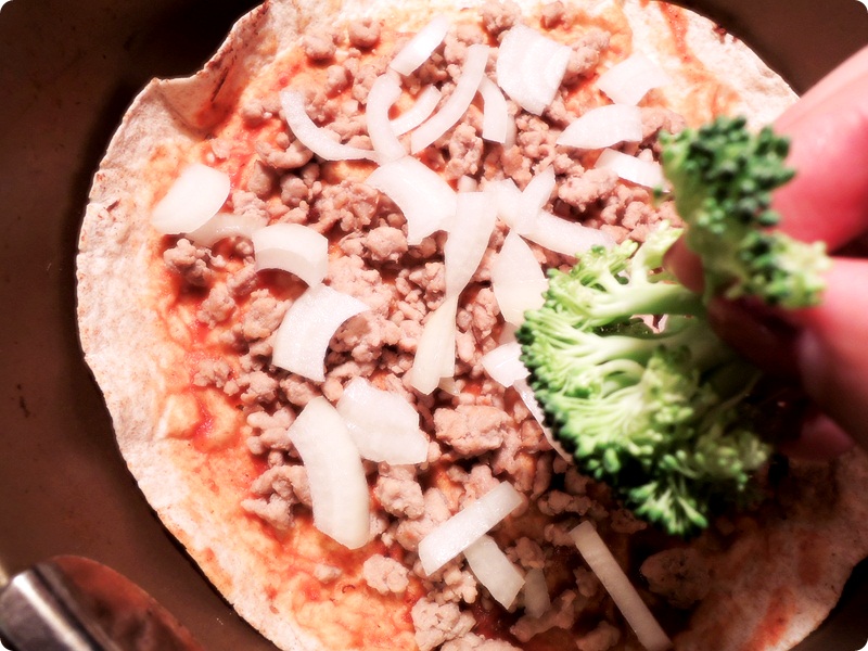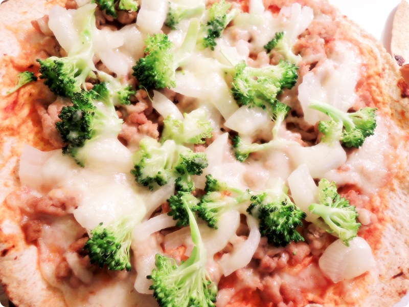 材料: トルティーヤ、Rondele - ニンニクとハーブチーズスプレッド、海鮮醤、醤油、トマトペースト、ペパロニ、ピザソース、七面鳥の挽肉、タマネギ、ブロッコリー、モッツァレラチーズ