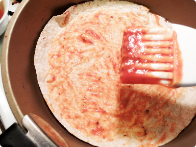불을 아주 약하게 한뒤 피자 소스를 발라요~