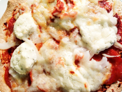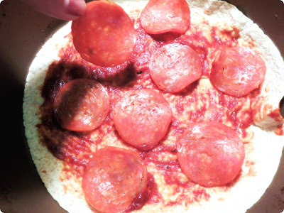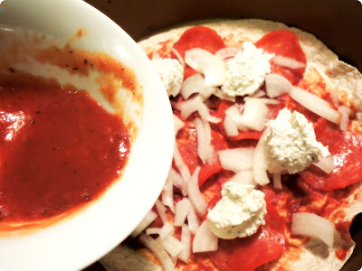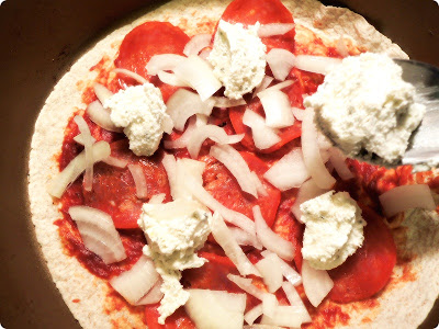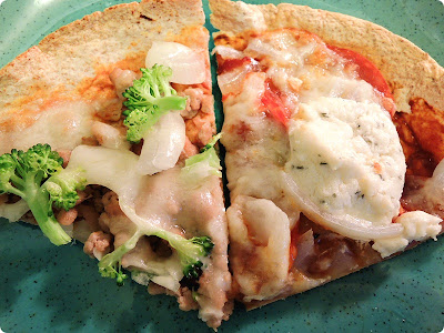 Ingredients: tortilla, Rondele - Garlic and Herbs Cheese Spread, hoisin sauce, tomato paste, pepperoni, pizza sauce, ground turkey, onion, broccoli, low fat mozzarella cheese