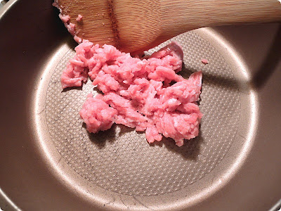 오일을 두르지 않은 마른 후라이펜에 간 칠면조를 굽는데요 소금이나 후추 넣지 마세요..