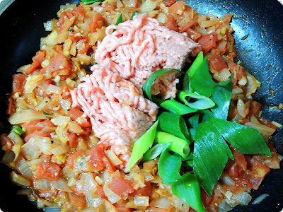 While the egg plants are grilling, add the pork and green onion's hair(??)