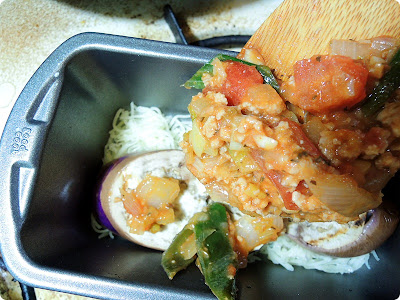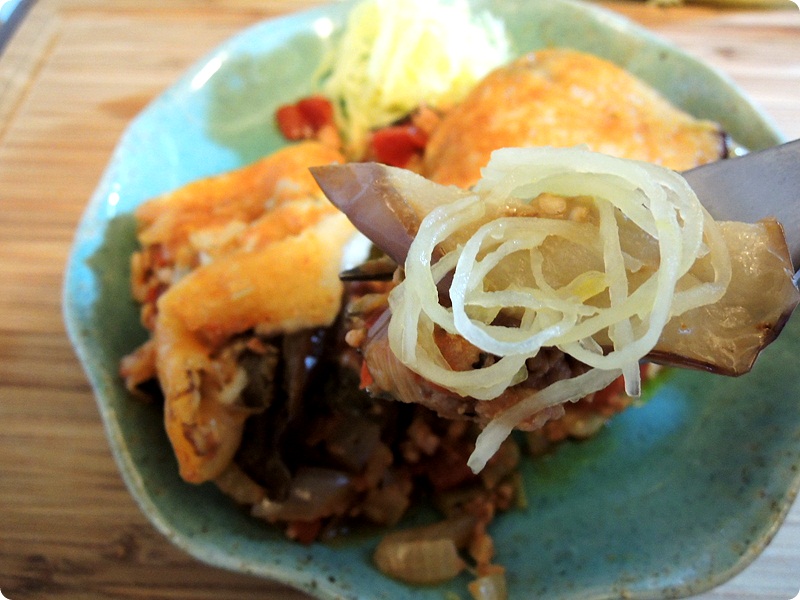 Ingredients: eggplant, ground pork, chopped onion, zucchini noodles, chopped green onions, mozzarella cheese
