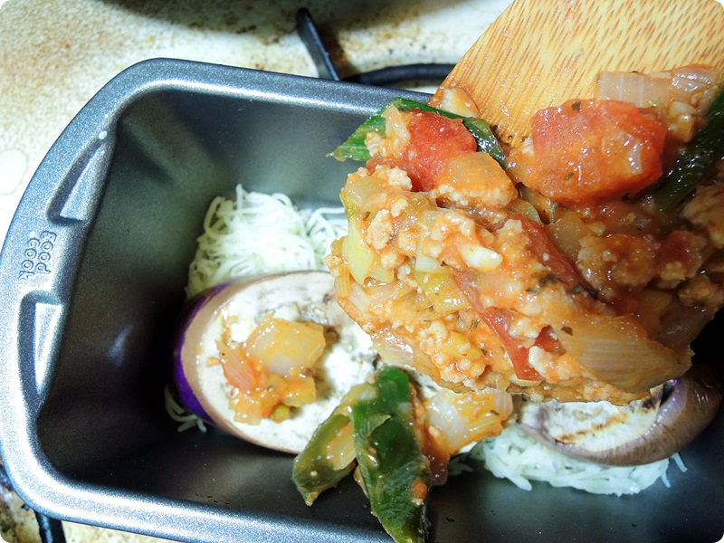 材料:ナス、行くには豚肉、玉ねぎ、麺カボチャ、ねぎのみじん切り、モッツァレラチーズ、
