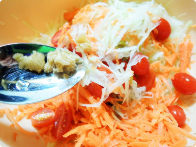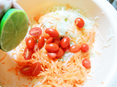 재료 : 파파야, 할라피뇨, 야자 설탕, 당근, 체리 토마토, 마늘, 생선 소스, 라임