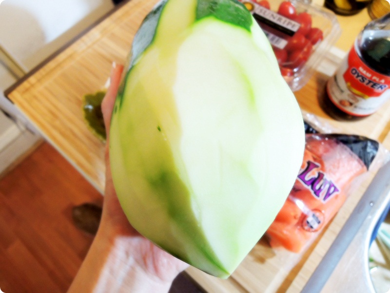 파파야의 껍질을 깨끗하게 벗겨냄니다.. 파파야가 없을경우엔 국수호박을 사용해주세요..