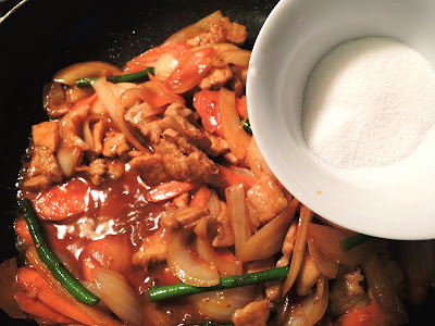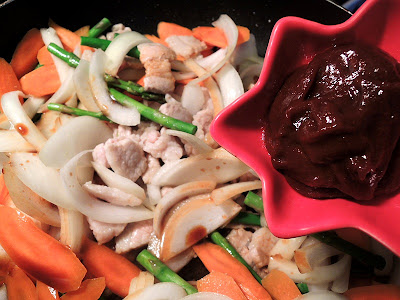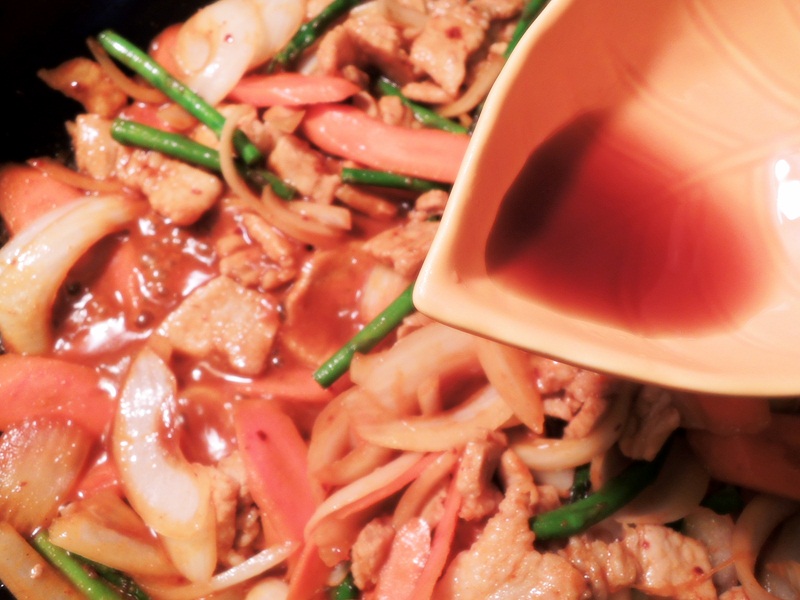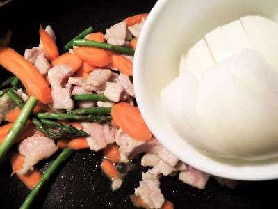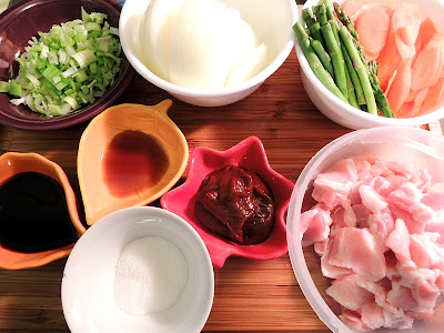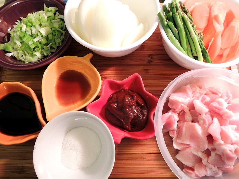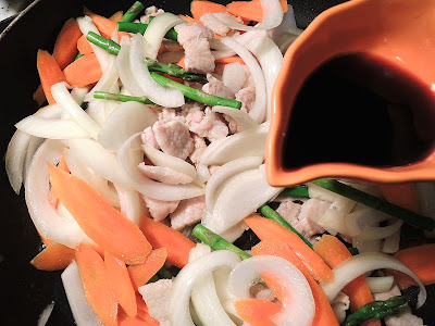 材料: sliced pork, carrots, asparagus, onion, leek, sugar, soy sauce, sesame oil, hot pepper paste.