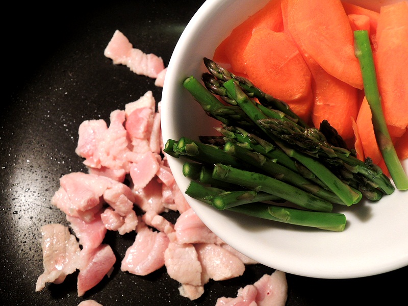 When the meat is half cook, Add asparagus and carrots.
