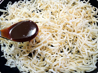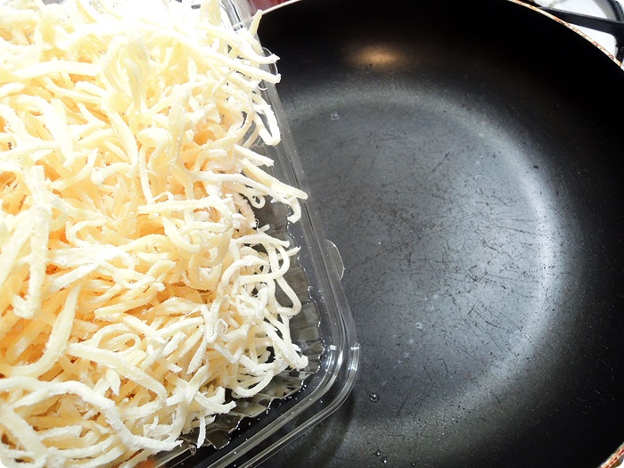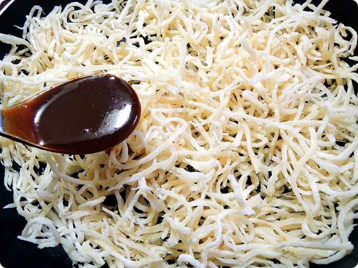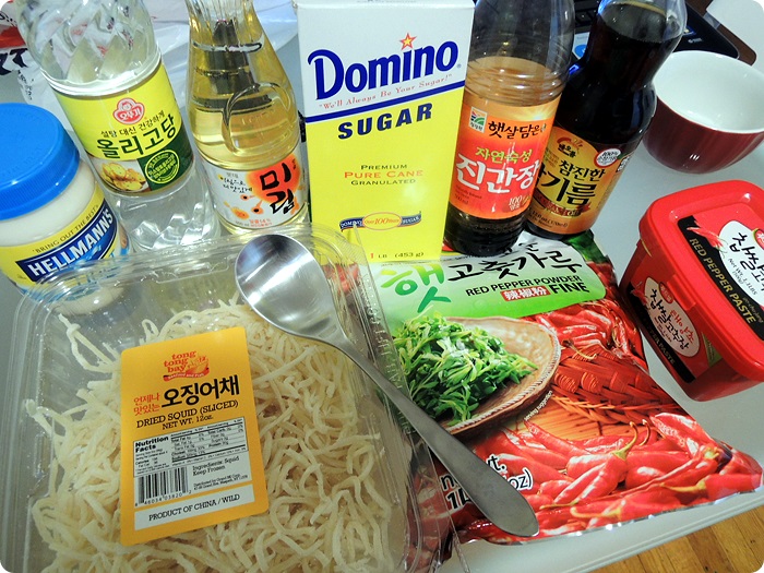 Ingredients: dried squid, red pepper powder, hot pepper paste, mayonnaise, oligosaccharides, mirin, sugar, soy sauce, sesame oil, sesame seeds (optional)
