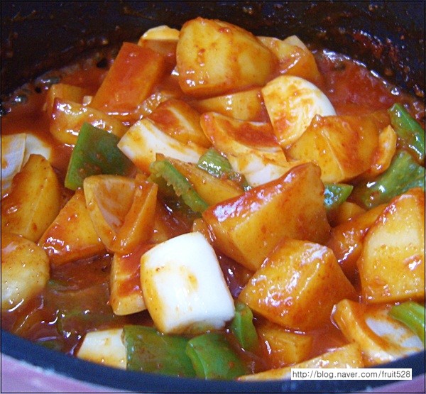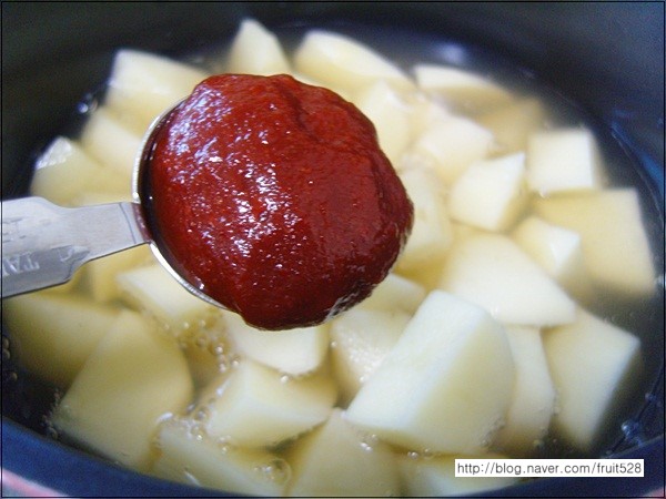 감자,사과육수(본문참조),고추장, 냉장고속야채,소금,간장,설탕을 추가할수 있읍니다