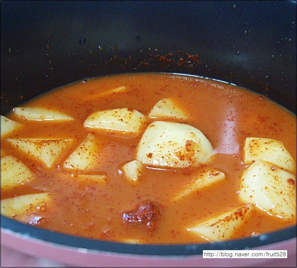 냄비뚜껑 열어보니 감자가 양념장에 잘 졸여지고 있어용~