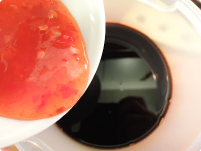 ソース:二班長(家になくてそのままsweet and spicy saucではなく、しました)、ごま油、ラー油、砂糖、醤油、みりん、コーンスターチ.