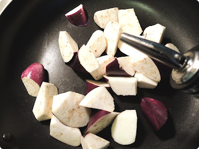 Let's cook the tofu and oonion~ :) 두부랑 양파를 기름 조금 넣고 구웠어요..