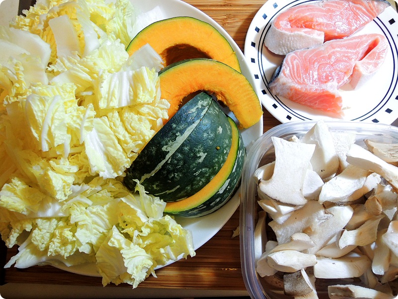 夕食材料:白菜、キノコ、カボチャ、サーモン