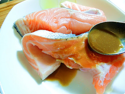 I cleaned and picked the salmon's bones and marinated with 1/2 sauce.