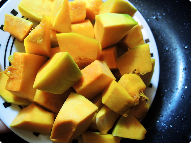 Now, time to cook the kabocha cubes all the way with good amout of cooking oil.