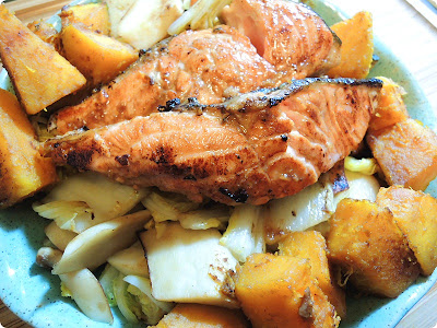Dinner ingredients: cabbage, mushrooms, Kabocha and salmon