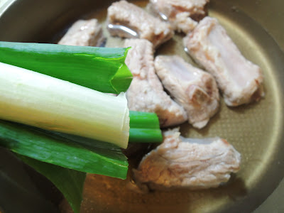 Let's give some flavors to the pork ribs. I divided the pork ribs and add some water to cover them.