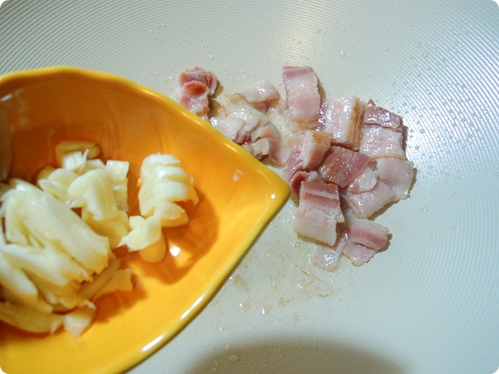 베이컨에서 기름이 나올때쯤 다진 마늘을 넣습니다.