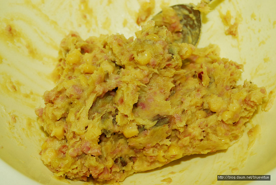 찐고구마를 조물 조물 으깨주세요.
