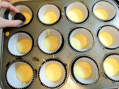 Fill the cupcake molds with the cake better little bit and place the oreo balls.