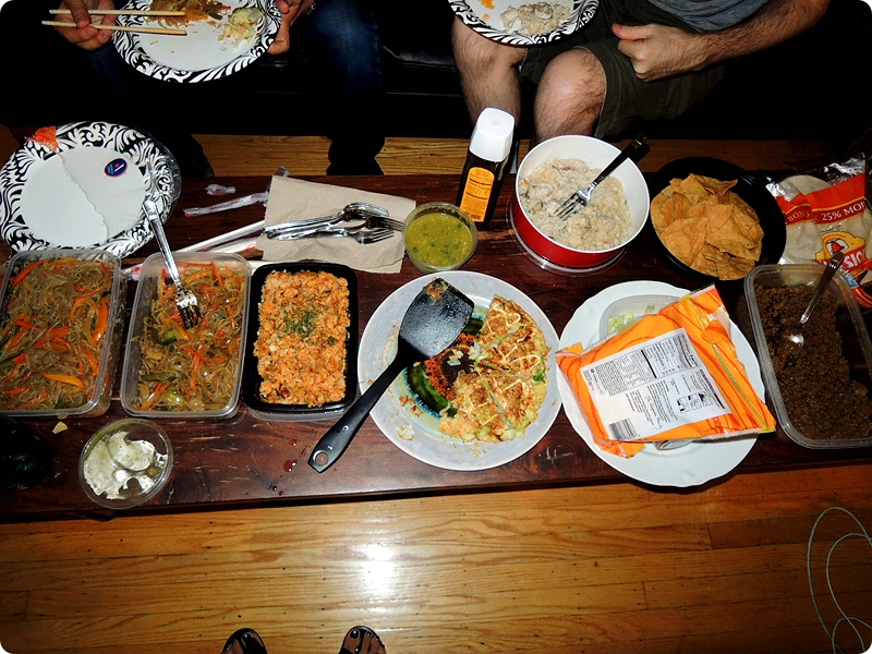 왼쪽부터) 제가 만든 잡채, 일본언니 남편이 만든 김치볶음밥, 유끼언니의 오꼬노미 야끼, 타코 (타코는 배가 너무 불러서 못먹었어요..)