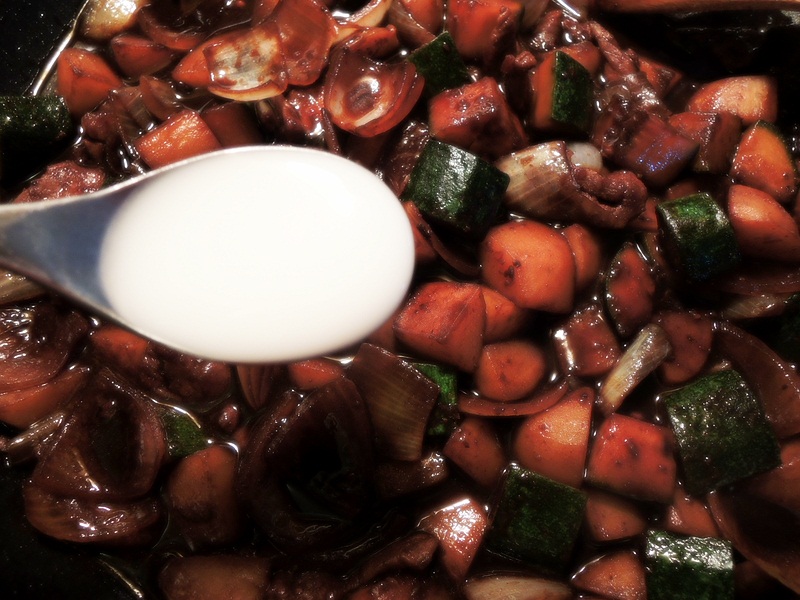 야채들에서 물이 조금 나올껀데요.. 이때 물에 갠 옥수수가루를 두스푼 넣어요..