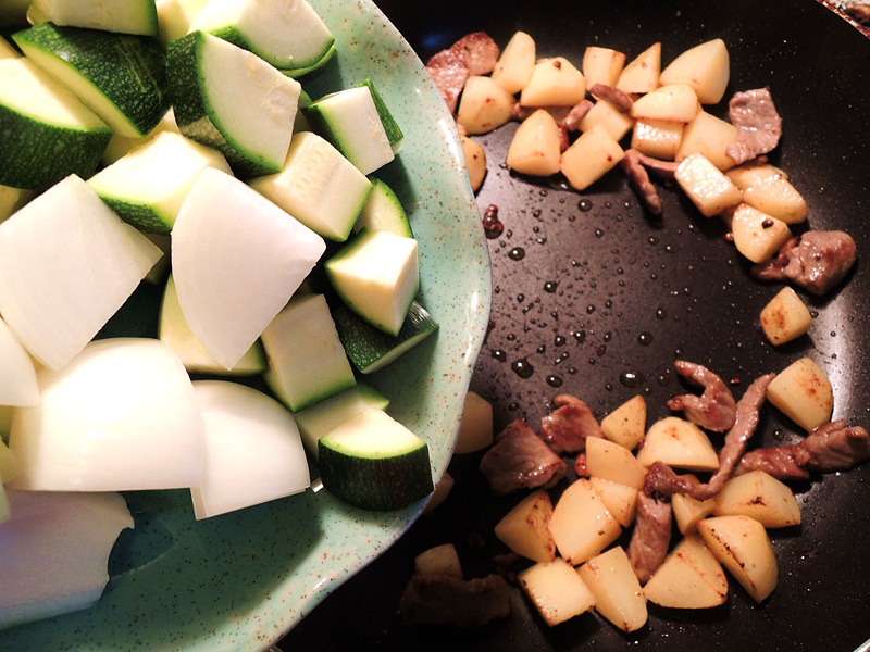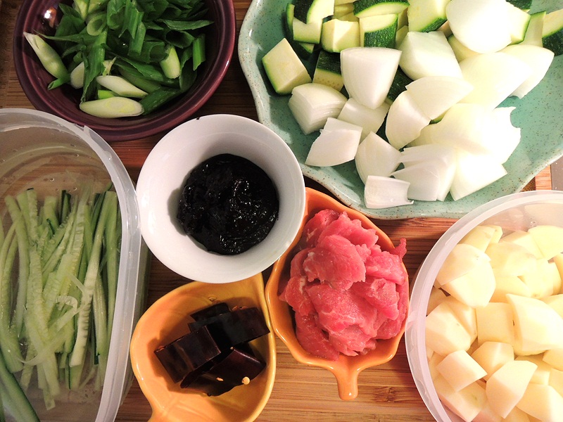材料:肉、ズッキーニ、玉ねぎ、ネギ、ジャガイモ、乾燥唐辛子、キュウリ、チュンジャン