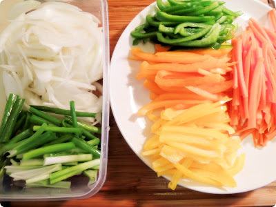 양파, 파, 삼색피망, 당근과 썰어둔 쇠고기.