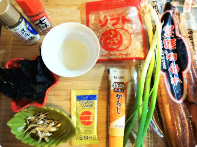 장어, 미림, 화이트와인, 간장, 다시마, 멸치, 보니토, 김, 파,겨자