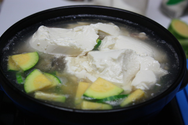 뚝배기에 육수물 부어 끓이다가 순두부+바지락+오징어 넣어서 끓입니다,.