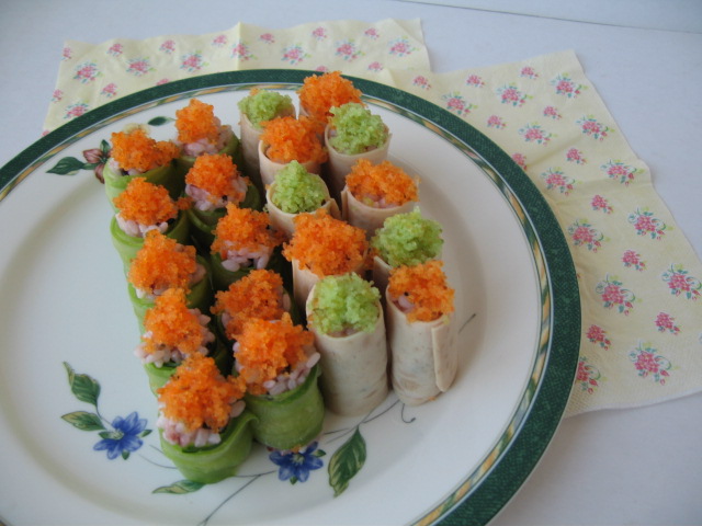 6.가지런하게 접시에 올려담은뒤,위에 색색깔로 날치알 그린과 레드로 장식합니다.
