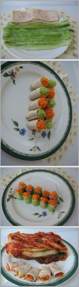 5.슬라이스한 오이로 돌돌말아주고,햄으로 돌돌 말아줍니다