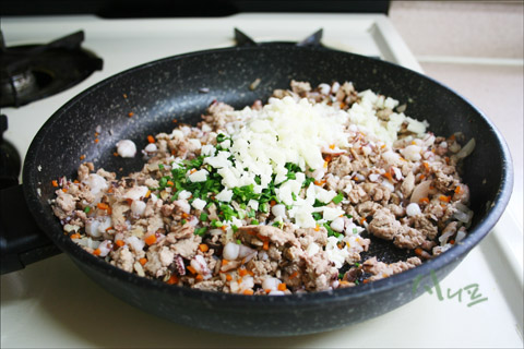 채소들과 오징어가 익음 불을 끄고 부추와 피자치즈 1/2컵을 넣고 잘 섞어준 후